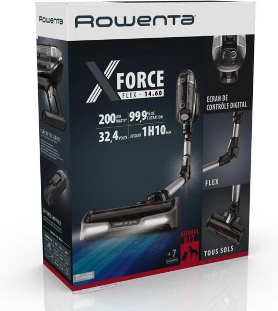De Rowenta X-Force Flex 14.60 RH9958 – Steelstofzuiger vindt schoonmaken opnieuw uit door krachtige schoonmaakprestaties te combineren met de beste gebruikservaring. De unieke DigitalForce-motor zorgt voor een zuigkracht van 200 Airwatts voor geweldige prestaties en resultaten. De krachtige verwisselbare batterij zorgt voor een autonomie tot wel 1 uur en 10 minuten*, zodat je gemakkelijk je hele huis kunt stofzuigen zonder tussendoor te hoeven opladen. Bedien de stofzuiger snel en gemakkelijk met het controle display en de boost trigger; Bekijk live de autonomie per minuut en stel gemakkelijk in op welk van de 5 standen jij wilt stofzuigen. Dankzij de boost trigger ben je voorzien van extra zuigkracht met slechtst een enkele knop.