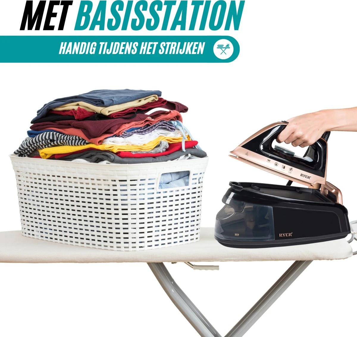 Het stoomstrijkijzer beschikt over een handig basisstation waar het ijzer niet alleen handig op neergezet kan worden tijdens het strijken, maar ook handig mee opgeborgen kan worden. Het basisstation beschikt over een handig ‘Lock & Carry’ haakje waardoor het stoomstrijkijzer stevig in het station blijft zitten en er dus niet zomaar vanaf kan vallen. Ook maakt het basisstation een einde aan losliggende kabels, het heeft een open ruimte waar de kabel in opgeborgen kan worden. Na gebruik kan je dan eenvoudig de twee meter lange kabel opbergen zonder dat die los langs het station hangt. Daarnaast wordt er ruimte bespaart doordat de 1,2L afneembare watertank zich ook in het basisstation bevindt. RYER is dus niet alleen multifunctioneel, maar ook ruimtebesparend.