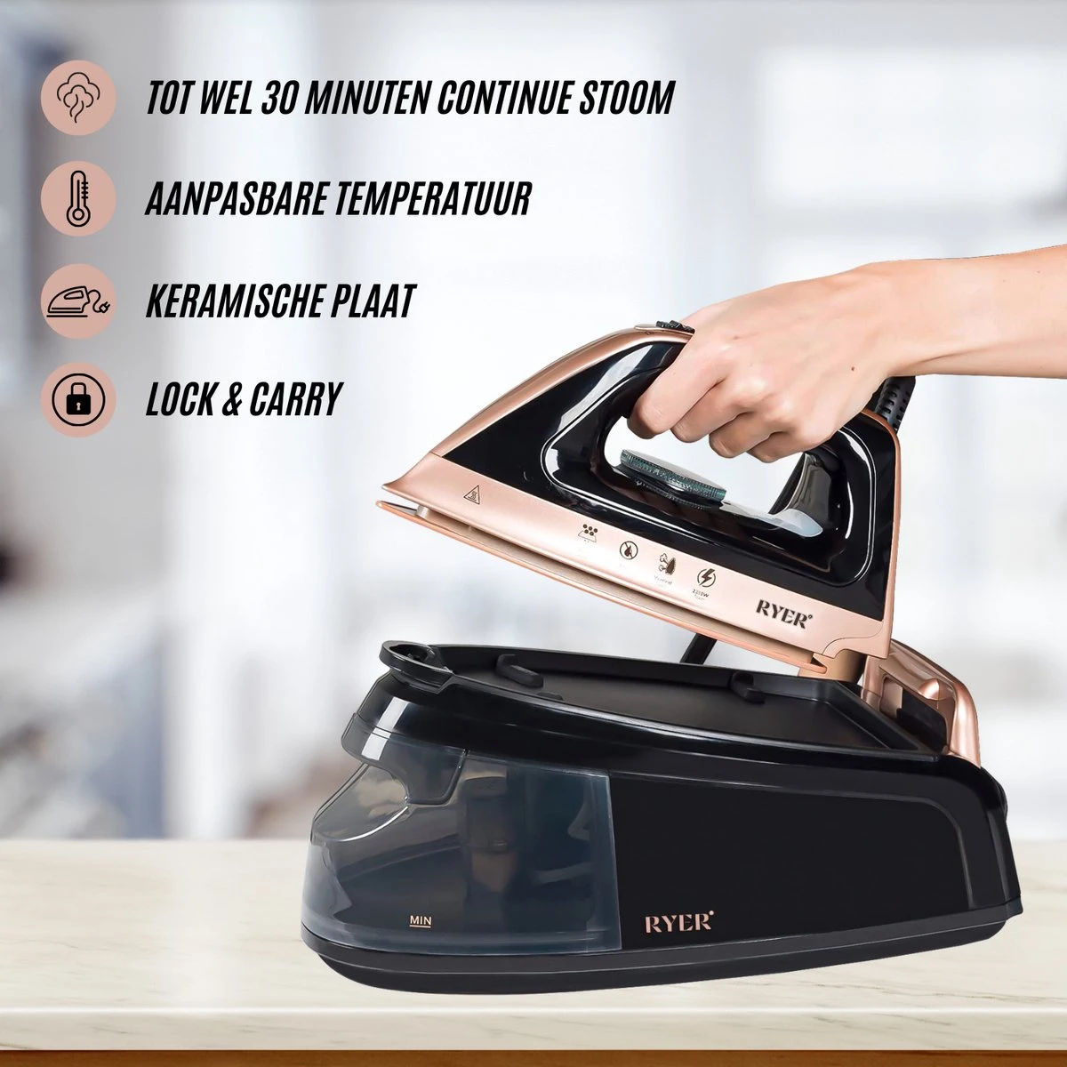 Kijk jij ook altijd op tegen die berg kleding die gestreken moet worden? Met het Ryer stoomstrijkijzer ben je in mum van tijd klaar met het strijken van je was. Het stoomstrijkijzer is geschikt voor vrijwel alle stoffen. Zeg gedag tegen vervelende kreukels in kleding, gordijnen, beddengoed en soms zelfs meubels. In combinatie met de werking van stoom en de keramische plaat, strijk jij zo alle kreukels uit de stof. Met de 1,2L afneembare watertank kun je vaak in één keer je wasgoed strijken en hoef je minder vaak het water bij te vullen. Het basisstation van het stoomstrijkijzer zorgt ervoor dat je het ijzer makkelijk tijdens het strijken neer kunt zetten, zonder zorgen te hoeven maken om brandplekken. Ryer zorgt voor een kreukloos eindresultaat.