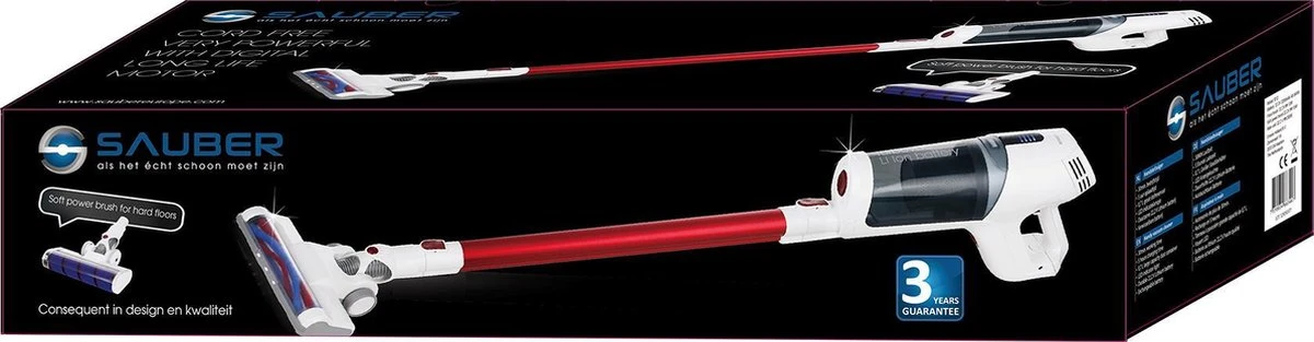 De nieuwe Sauber R12 snoerloze 2-in-1 steelstofzuiger met elektrisch aangedreven extra zachte borstel speciaal voor harde vloeren en een elektrisch aangedreven AnimalPro borstel, geschikt voor tapijt en vloerkleden maakt de traditionele stofzuiger overbodig. Ervaar de ongekend krachtige zuigkracht dankzij de 22,2 V digitale long-life motor in combinatie met 100% bewegingsvrijheid. Met de Sauber R12 kun je tot wel 30 minuten onafgebroken stofzuigen. De Sauber digitale motor zorgt voor een 30% hogere zuigkracht en gaat tot 40% langer mee in vergelijk met normale motoren. De steelstofzuiger is ook te gebruiken als kruimelzuiger in combinatie met de meegeleverde accessoires, ook zit er een muurbeugel bij om de steelstofzuiger handig op te bergen. Met een gewicht van 2,4 kg is de sauber R12 vrij licht. Je tilt hem dus makkelijk op.
