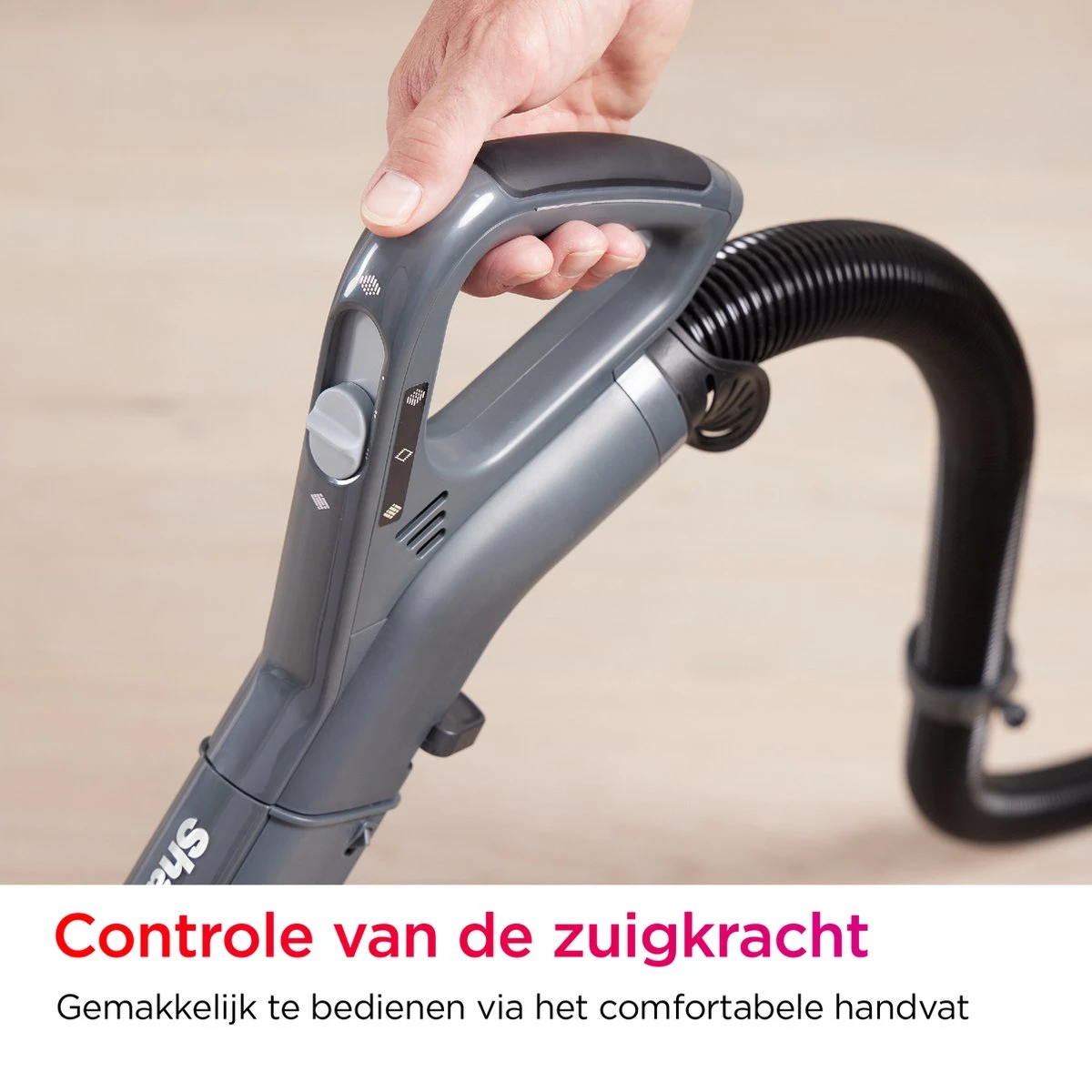 Met een zuigkracht van wel 175 watt zuigt deze stofzuiger krachtig stofdeeltjes en vuil in huis op. De schakelaar op de handgreep gebruik je om aan te geven of je een hard oppervlak of tapijt aan het schoonmaken bent, waardoor de zuigkracht van de stofzuiger aangepast wordt en ieder oppervlak op de perfecte wijze schoongemaakt kan worden. Zo is jouw huis in een mum van tijd brandschoon en stofvrij.