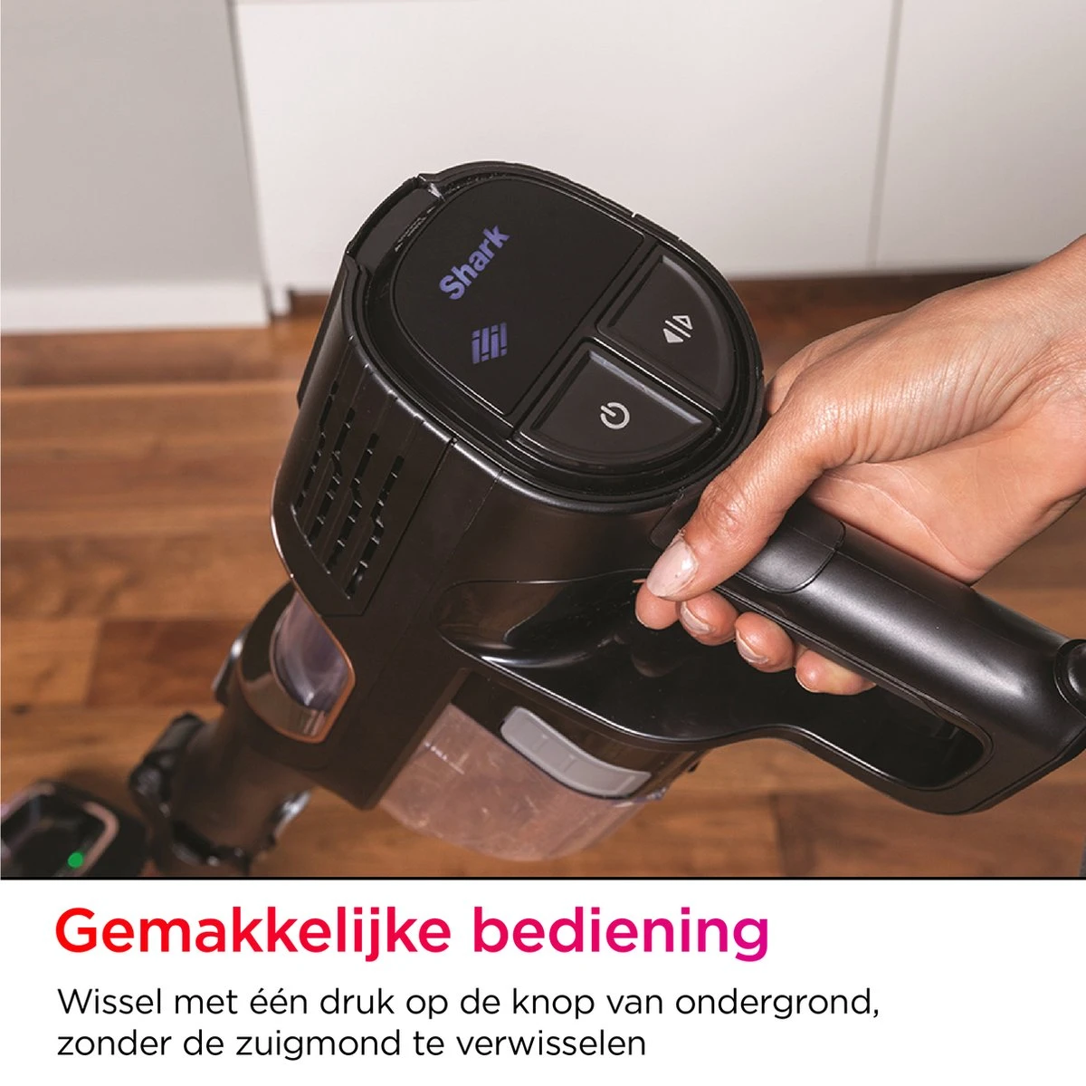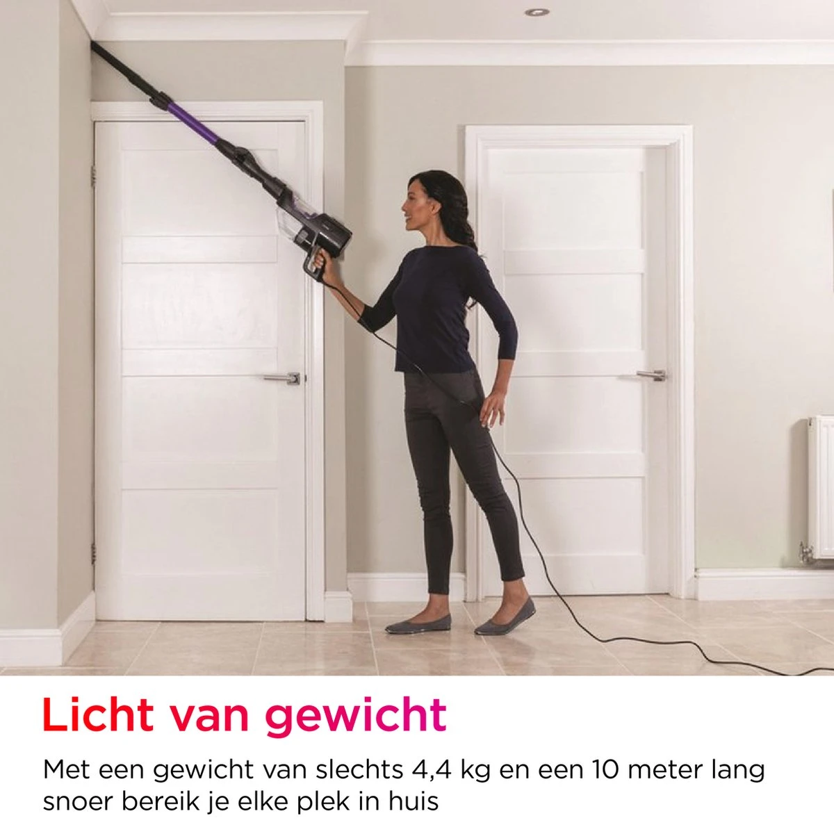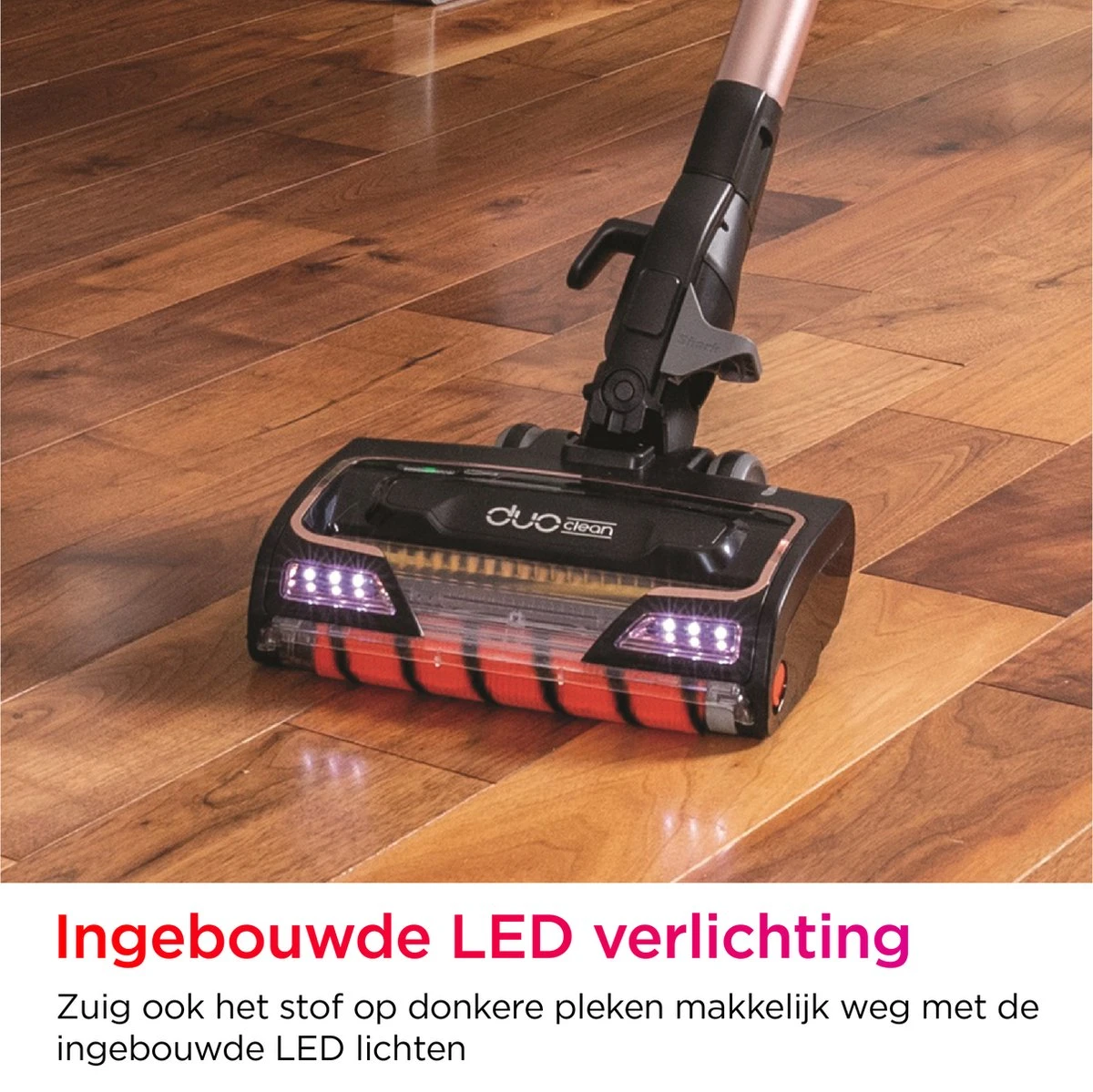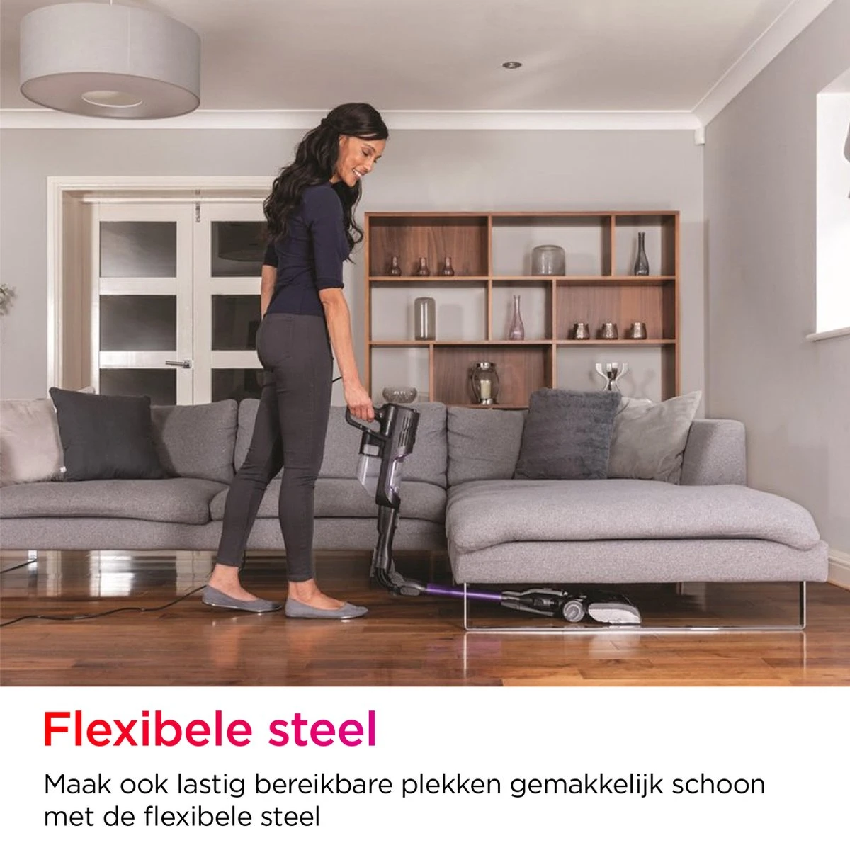 De flexibele steel van de stofzuiger is buigbaar met slechts één druk op de knop. Hierdoor maak je zonder moeite schoon onder lage bedden, kasten en banken. Karakteristieke ledlampjes zorgen ervoor dat u het stof onder de meubels niet over het hoofd ziet. Daarnaast is deze flexibiliteit handig voor het opbergen van de stofzuiger; je kunt deze gewoon inklappen om vrijstaand op een klein oppervlak op te bergen.