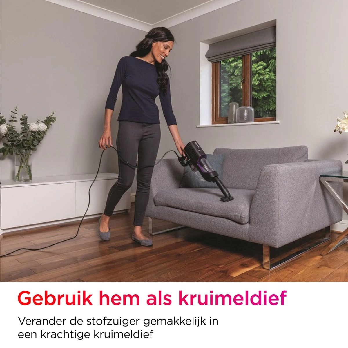 Verander de stofzuiger met 1 druk op de knop in een kruimelzuiger. Perfect voor het stofzuigen van trappen, banken, bekleding of de binnenkant van de auto! Twee handige hulpstukken, een kierenzuigmond en kleine borstelzuigmond, worden ook meegeleverd voor het schoonmaken van bekleding, kieren en oppervlakken. Gebruik de steel in handheld-modus om op hoge plekken schoon te maken.