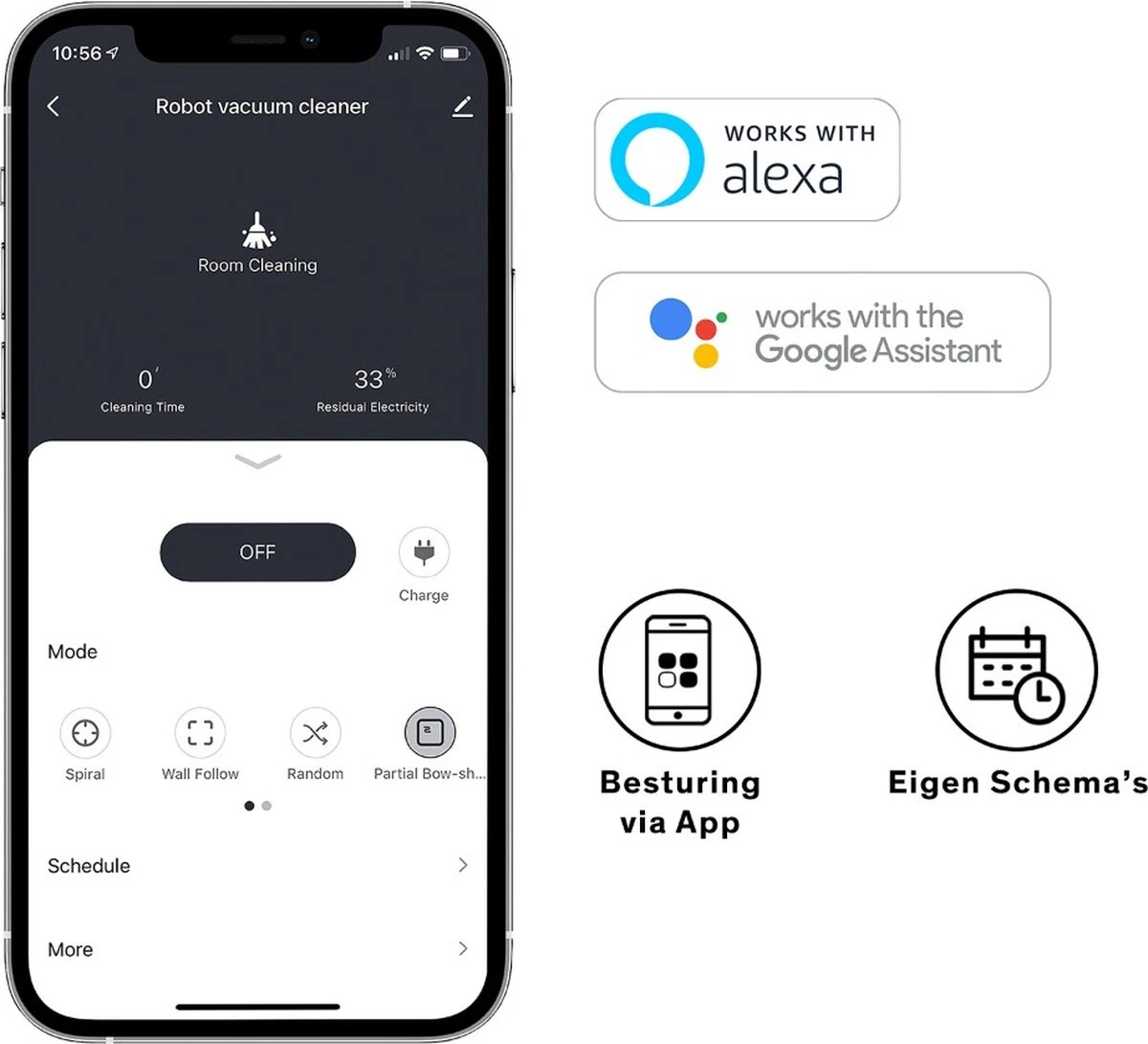 Wil je de robotstofzuiger activeren, maar is je telefoon even niet in handbereik? Vraag dan de Google Assistent of Amazon Alexa om de robotstofzuiger te activeren vanuit je luie stoel.