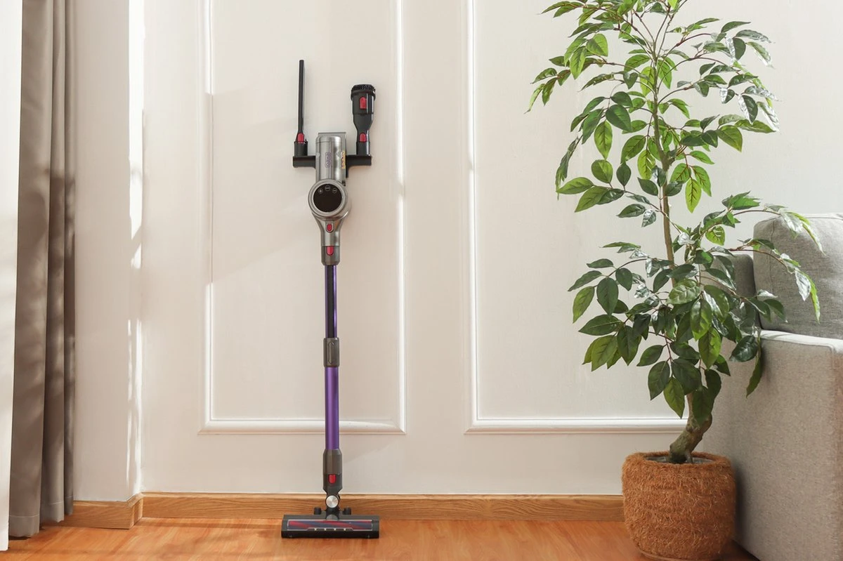 Dankzij zijn handige muurbevestiging kan de steelstofzuiger inclusief hulpstukken eenvoudig opgeborgen worden en laadt de stofzuiger na gebruik op. Dankzij het strakke ontwerp is het een echte eyecatcher in jouw interieur. De krachtige accu werkt op 2000Mah 6-cel batterij.