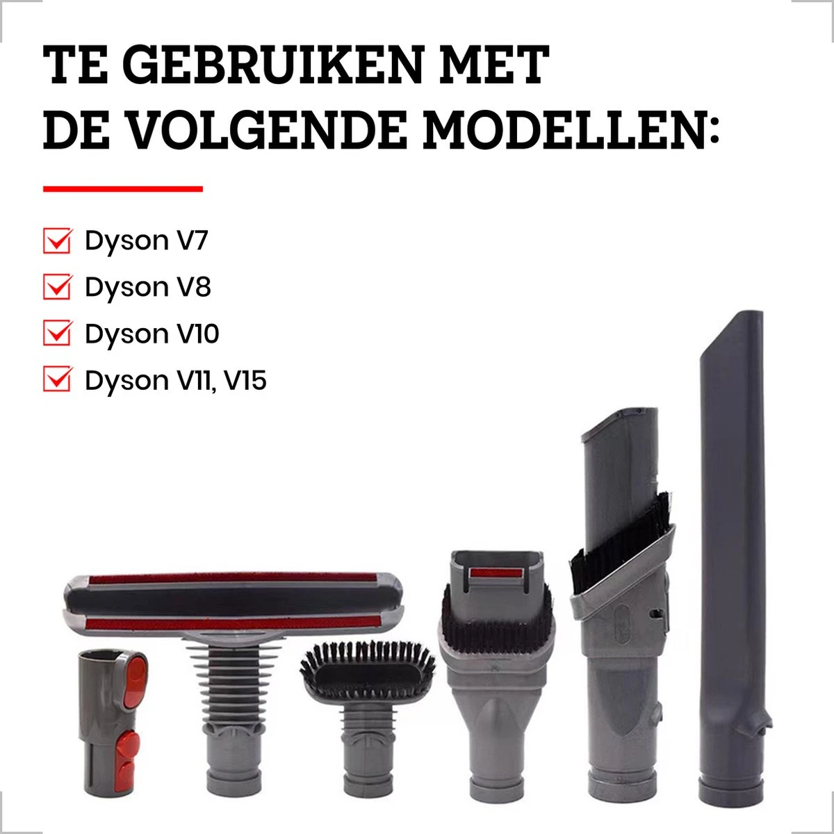 Let op: Er wordt een adapter meegeleverd, sluit deze aan om gebruik te maken van de onderdelen op de Dyson V7-15. Zonder adapter passen de kopstukken op de Dyson V6.