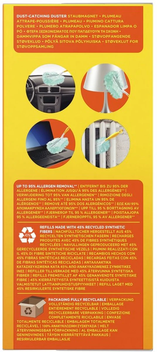 Swiffer Ambi Pur navuldoekjes dienen te worden gebruikt met de Vloerreiniger om vuil, stof en haar op elk vloeroppervlak in je huis te vangen en vast te houden. 3x beter dan een gewone bezem en ze laten je vloeren, met geur van Ambi Pur, heerlijk fris ruiken. Hij kan ook worden gebruikt ter aanvulling van je stofzuiger, om het fijne overige stof op te vangen of als schoonmaakmiddel tussendoor, een truc om te voorkomen dat je te veel grondig schoonmaakt. Hoe? Waarom? Dankzij de dikte en het specifieke patroon van de stofdoekjes en hun antistatische werking vangt en houdt het doekje al het stof vast. Bovendien kan je met de 360° beweegbare kop van de Swiffer Vloerreiniger overal schoonmaken, zelfs op moeilijk bereikbare plekjes zoals onder de koelkast, het fornuis en de vaatwasser, onder bedden en banken en zelfs in hoeken en randen waar bezems en dweilen niet bij kunnen. Dat is toch geweldig? Met de Swiffer droge stofdoekjes gaat schoonmaken sneller en gemakkelijker dan ooit. Handige tips: Ze zijn vooral handig om het haar van je huisdieren, dat constant uitvalt, te verwijderen of als je last hebt van een stofallergie. De Swiffer doekjes kunnen worden gebruikt op elk hard oppervlak, zoals: al dan niet geboend linoleum, vinyl, keramische tegels en behandelde houten vloeren.