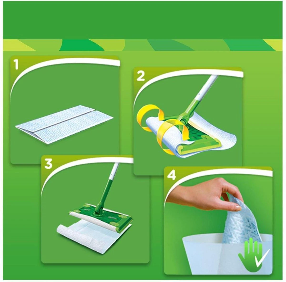 Houd je vloeren schoon en laat ze heerlijk ruiken met een unieke schoonmaakvloeistof die hardnekkige vlekken, vuil en verontreiniging oplost en diep in het doekje opslorpt, zodat het schoonmaken van tegelvloeren of linoleum vanzelf gaat. En om hardnekkige vlekken te verwijderen, kan je de kop omkeren en de vlekken schrobben met de groene schrobstrook. Doordat hij zo vlak is kan je plekken schoonmaken die je niet kan bereiken met andere vloerreinigingssystemen (onder banken, bedden, koelkasten en vaatwassers). Ja, je Swiffer vloerreiniger werd opeens een 2-in-2 tool: gebruik met de droge doekjes om het stof te vangen en met de vochtige dweildoekjes om schoon te maken. Ze zijn zelfs geschikt voor gebruik op houten vloeren. Gebruik de Swiffer vloerreiniger vochtige doekjes niet op onbehandeld, geolied of geboend parket, op onbehandelde natuursteen of tapijten.