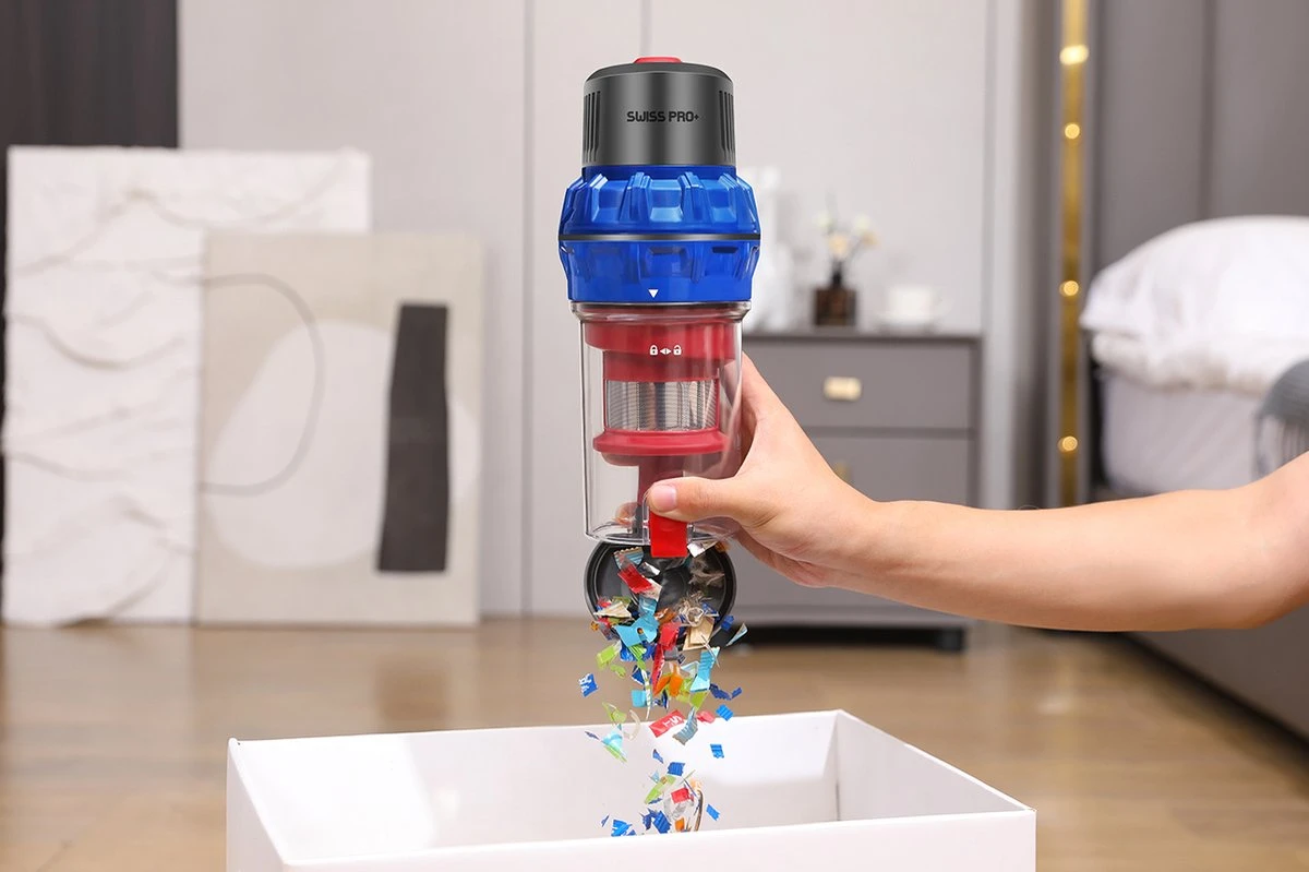 De stofzuiger is ontworpen zonder zak. Geen gedoe meer met het vervangen van stofzuigerzakken maar eenvoudig te legen met één druk op de knop. Met maar liefst een stofreservoir van 1 liter is de steelstofzuiger van Swiss Pro+ uniek in zijn klasse. Daarnaast wordt er gebruik gemaakt van een hoogwaardig Mirco- H10 HEPA+Multi-cyclonic dat pollen, allergenen en fijne stofdeeltjes filtert. Hierdoor kun je zeker zijn van het behoud van schone lucht in je huis. Het wasbare HEPA-filter is gemakkelijk te verwijderen en kun je gewoon reinigen onder de kraan.