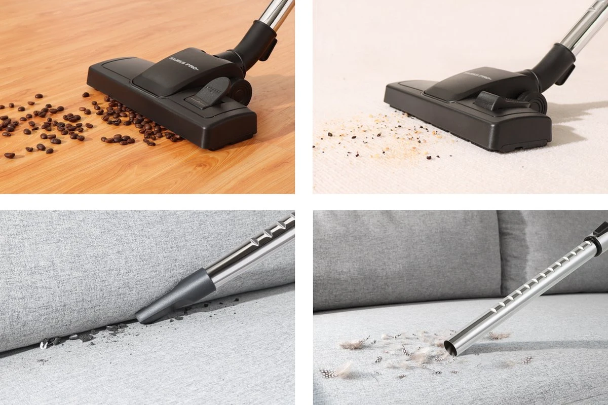 Deze vrije speciale Swiss Pro+ lijn biedt oplossingen voor zichtbaar en onzichtbaar in uw huis. Met een krachtige motor van 1500 watt wordt het vuil van het grofste tot het fijnste opgezogen en afgezet in een supergrote opvangbak.