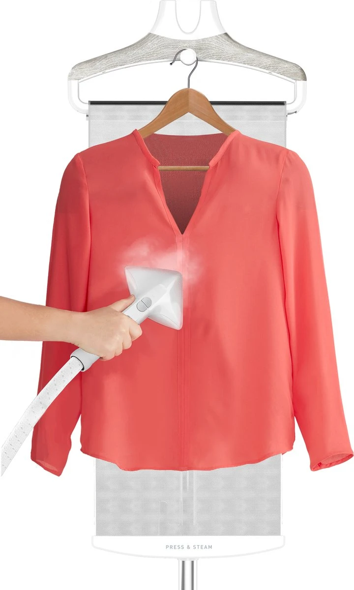 – Handige kledingstomer met praktische accessoires: kledingborstel, stoomkap en knijper om strakke vouwen te maken
