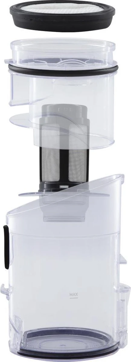 De stofzuiger is ontworpen zonder zak. Geen gedoe meer met het vervangen van stofzuigerzakken, maar een eenvoudig te legen stofreservoir met een inhoud van 0.4 liter. Met één druk op de knop leeg je het reservoir en kan je de stofzuiger weer gemakkelijk opbergen. Het stofreservoir is voorzien van een filter die allergenen en fijne stofdeeltjes filtert. Reinig het filter en het cycloonsysteem eens per 4 legingen van het stofreservoir voor een optimaal resultaat na iedere schoonmaakbeurt.