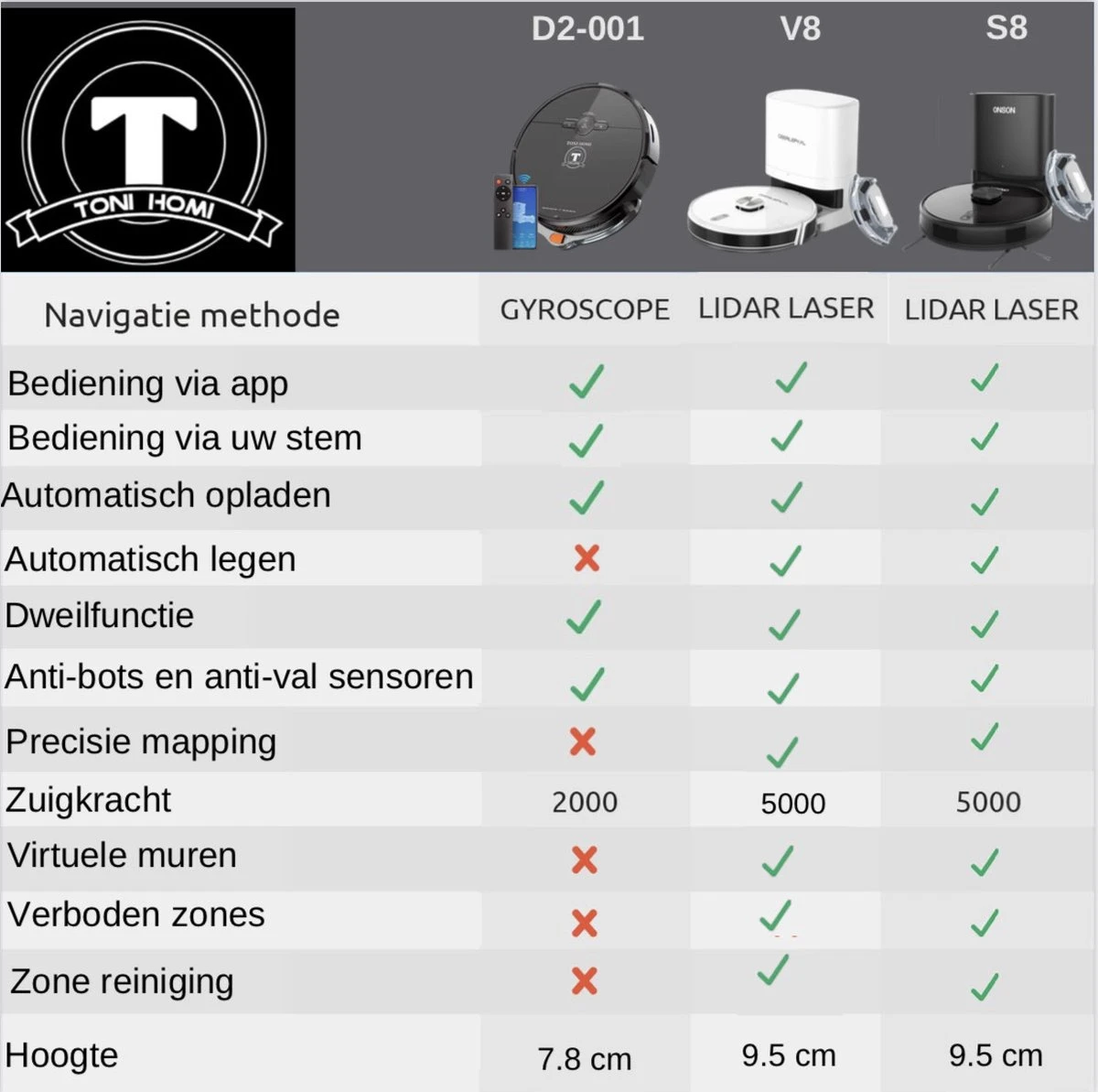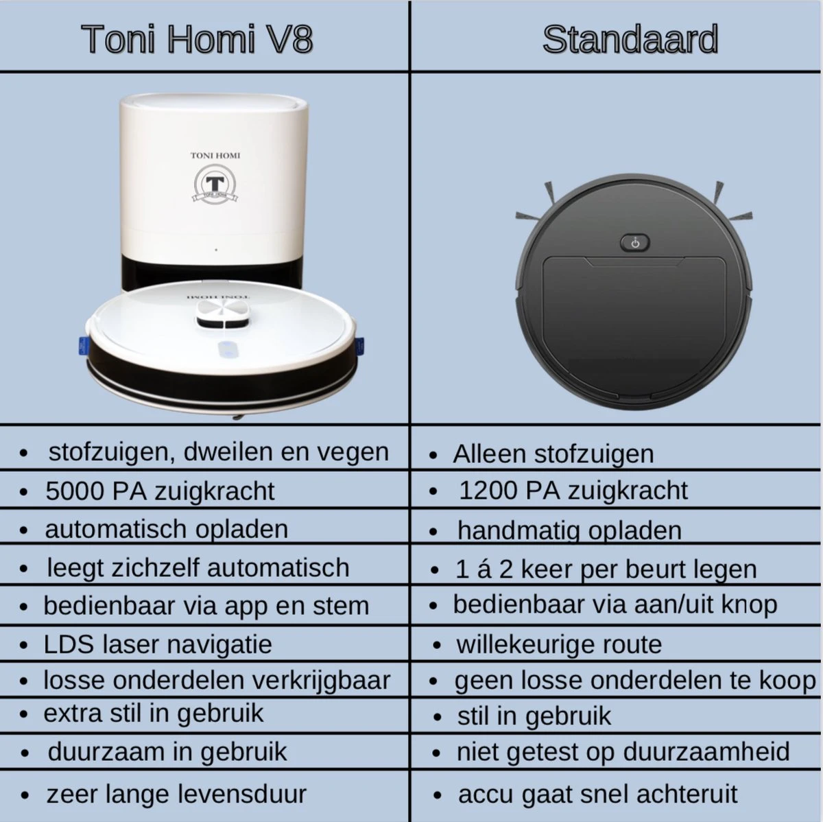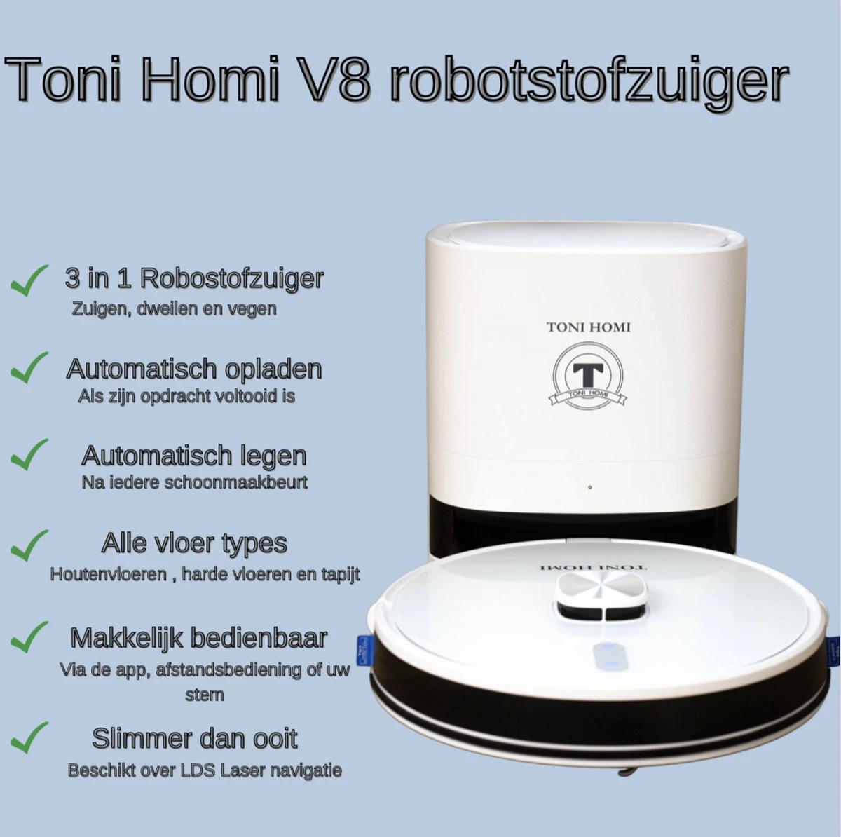 De TONIHOMi V8 robotstofzuiger met dweilfuntie behoort met zijn innovatieve functies tot de beste robotstofzuigers van 2023. De V8 beschikt over een slimme 360° Laser-Radar met LDS én SLAM technologie. Uw woonkamer of een dergelijke ruimte zal de V8 robotstofzuiger in zijn geheel scannen wat u vervolgens terug kunt zien in de app op uw telefoon. Zo kunt u ten aller tijden zien waar de robotstofzuiger zich bevindt of dat nou bij zijn station is of in beweging u houdt altijd het overzicht in de app. In de app kunt u de robotstofzuiger ook gemakkelijk verder instellen. Zo kunt u een schoonmaakprogramma aanmaken, waarbij u de schoonmaak dagen aangeeft en de gewenste tijd van die dag. Als u plekken heeft waar de robotstofzuiger niet mag zuigen of dweilen kunt u gemakkelijk in de gescande kaart in uw app verboden gebieden aangeven zodat de robotstofzuiger dat aangegeven gebied vermijd. Met de 5000 PA sterke zuigkracht zuigt de V8 gemakkelijk borrelnoten, broodkruimels en hondenharen op. Met de krachtige ingebouwde motor is niks de robotstofzuiger teveel. Door de ingebouwde geluidsdempers is de stofzuiger vrijwel geruisloos. De robotstofzuiger beschikt over een exclusieve lithium-accu waardoor hij tot wel 240m2 kan stofzuigen of dweilen achter elkaar. Nadat de robotstofzuiger zijn schoonmaakbeurt erop zit zal hij automatisch terugkeren naar zijn station waar hij automatisch wordt leeg gezogen en vervolgens wordt opgeladen voor zijn volgende schoonmaakbeurt.