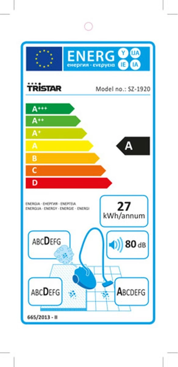 De stofzuiger verbruikt weinig stroom en is milieuvriendelijk. Daarom is de Tristar SZ-1920 Stofzuiger voorzien van energielabel A. Gelukkig hoef je qua comfort niets in te leveren: met het automatische snoeroprolsysteem, telescopische buis en het High Efficiency mondstuk is de stofzuiger van allerlei gemakken voorzien. Met het High Efficiency mondstuk kun je dus eenvoudig op zowel tapijt als harde vloeren stofzuigen. Als de stofzuigerzak (2 liter) vol is, kun je deze hygiënisch en gemakkelijk vervangen.