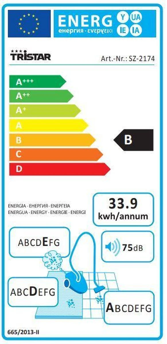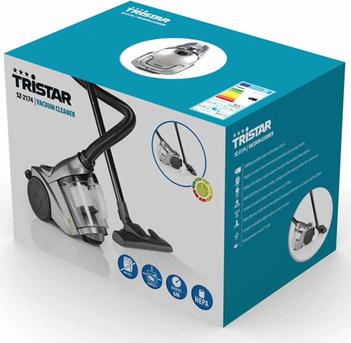 De Tristar SZ-2174 is een compacte basis stofzuiger zonder zak die handig is voor een huis met voornamelijk harde vloeren. De stofzuiger heeft een sterke zuigkracht op harde vloeren maar een matige zuigkracht op tapijt. Het gewicht van 3,6 kg is voor een stofzuiger erg licht. Hij beweegt daardoor soepel en je tilt hem makkelijk op. De Tristar SZ-2174 heeft een kort snoer van 4 m, waardoor hij minder geschikt is voor grote ruimtes.