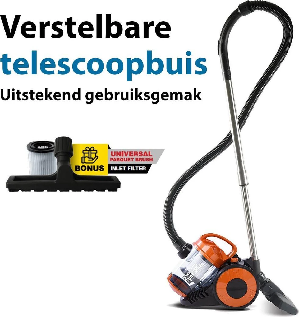 - Inbegrepen accessoires: telescopische buis, slang, combizuigmond, opzetstuk met borstel, koppelstukken