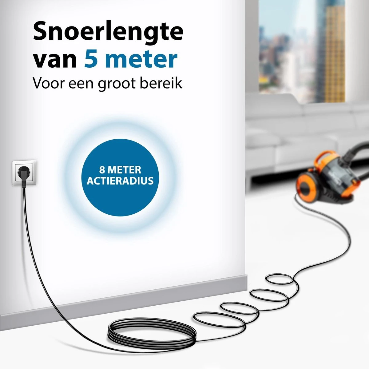- Door zijn compacte formaat en extra lange snoer is de stofzuiger makkelijk in gebruik
