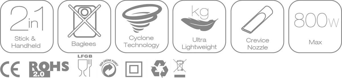 Dankzij zijn cycloontechnologie heeft de VS9 steelstofzuiger een zakloos stofreservoir, waardoor stofzuigerzakken overbodig zijn. Geen gedoe meer met stofzuigzakken, maar gewoon snel en hygiënisch reinigen. Je leegt het stofreservoir gemakkelijk in de prullenbak. De krachtige motor in combinatie met de zakloze filter voorzien van cycloontechnologie zorgt ervoor dat de meest fijne fijnstofdeeltjes en bacteriën zorgvuldig van elk gewenste oppervlak worden verwijderd. Bij aanschaf van de steelstofzuiger ontvang je ook een kierenzuigmond speciaal voor de handstofzuiger, die bestemd is voor het reinigen van moeilijk bereikbare plekken. Ideaal!