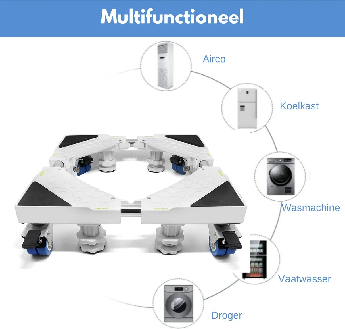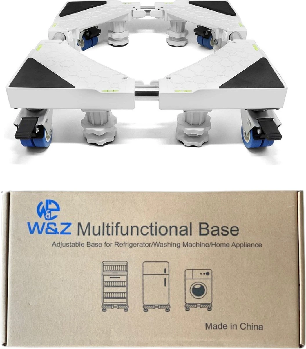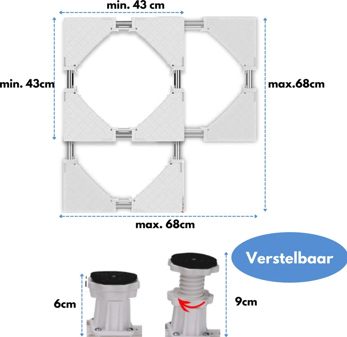 De verstelbare koelkaststandaard kan worden aangepast aan een breedtebereik van 43-68 cm, aan de zijkanten, van 43-67 cm en de basis kan worden verhoogd tot een hoogte van 10 tot 13 cm. Deze nieuwe versie is naast de verstelbare pootjes ook nog eens voorzien van wieltjes. Hiermee kun je eenvoudig je wasmachine, vaatwasser of koelkast verplaatsen.