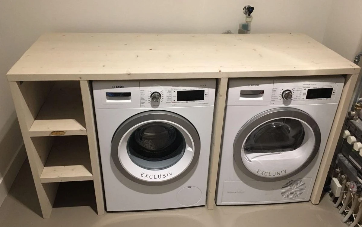 De buitenmaat van een compartiment in dit meubel voor een wasmachine of droger is: 68 breed, 70 diep en 90 cm hoog.