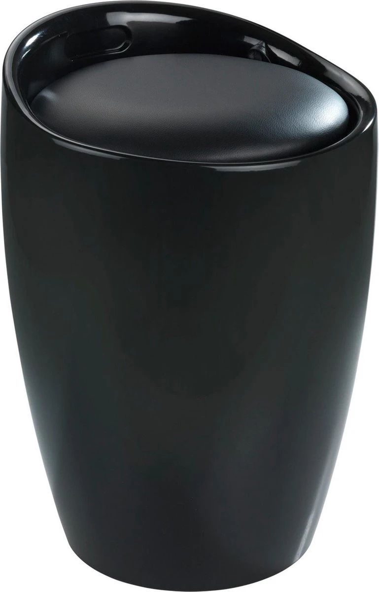Zwarte wasmand en badkamer kruk in 1.met uitneembare waszak van 20 liter.