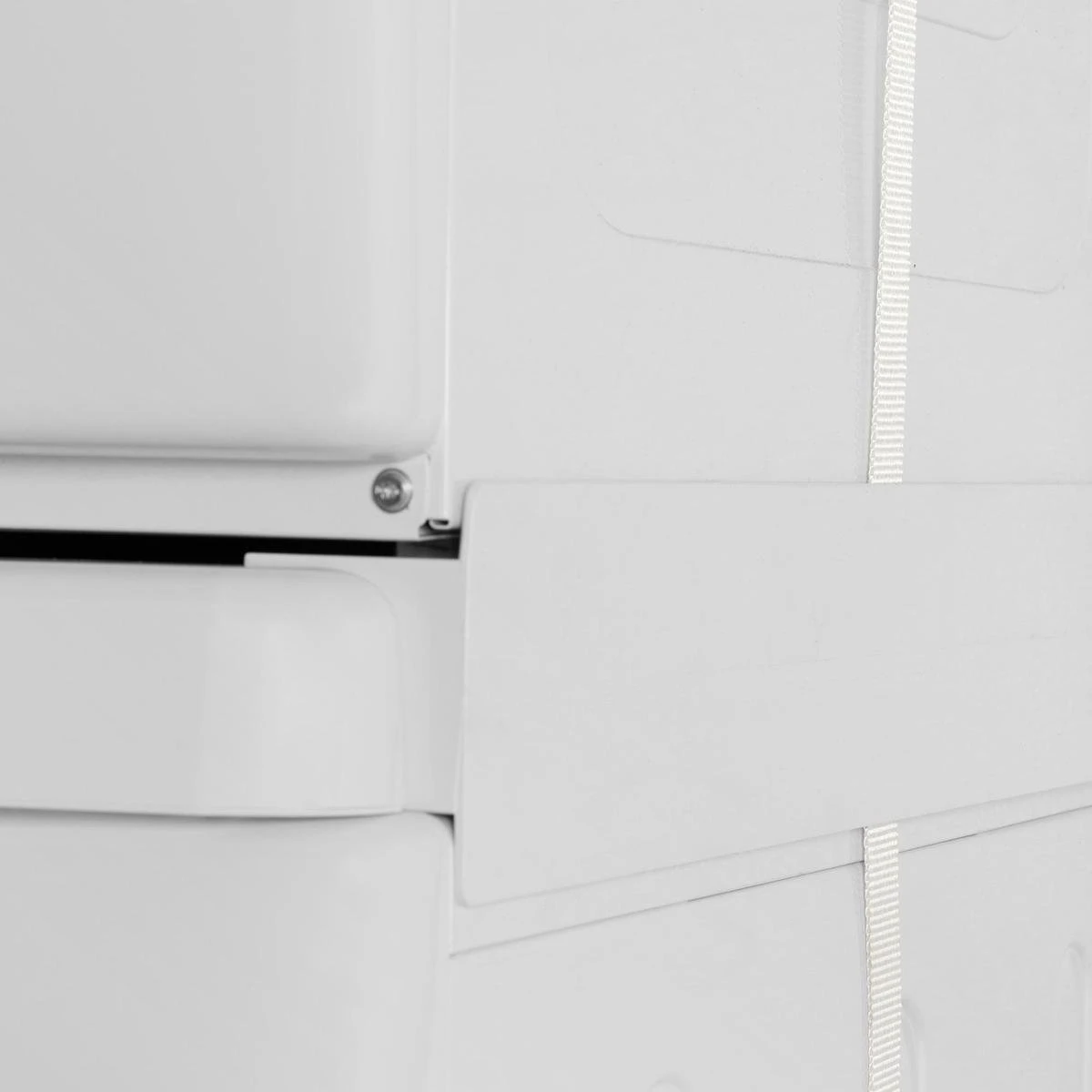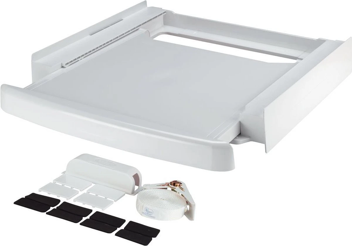 Universele stapelkit met safe-in-lock systeem. Dankzij deze veilige stapelkit kan je met een gerust hart de droger bovenop de wasmachine plaatsen. De uitschuifbare lade zorgt ervoor dat je gemakkelijk het wasgoed kan opvouwen. Universeel voor wasautomaten van 60x60cm.